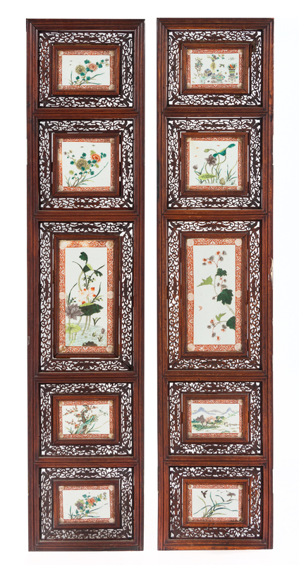 Two Famille Verte Porcelain Inset Hardwood Panels Height 57 x length 12 1/4 x width 1 inches (each).