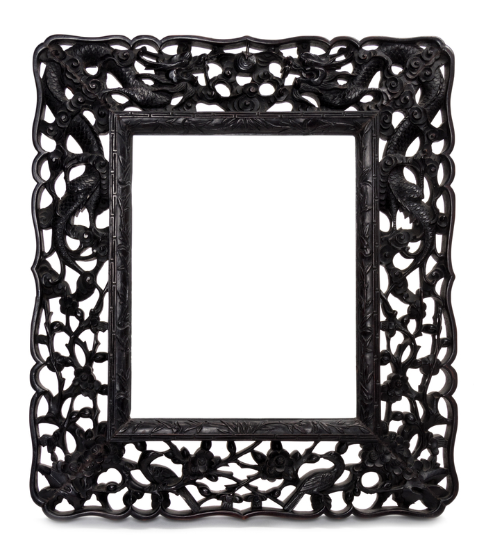 A Carved Zitan Picture Frame Height 16 1/2 x width 14 1/2 inches.