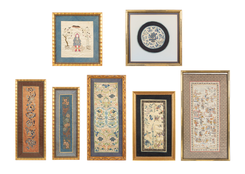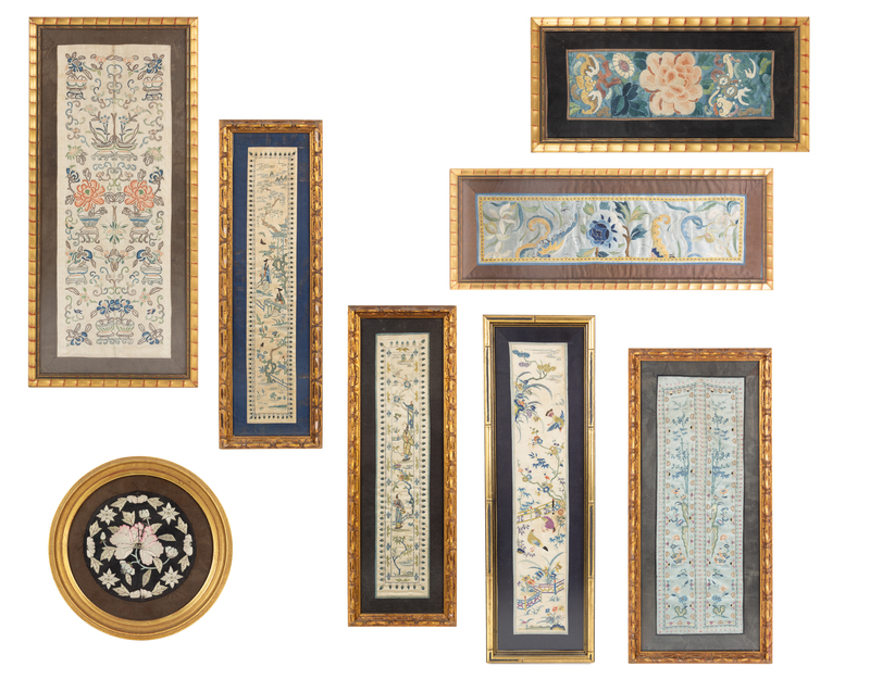 Fifteen Embroidered Silk Panels 26 x 13 inches (largest).