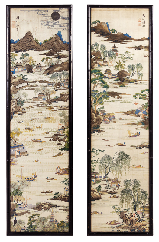 each of rectangular form, worked in multi-colored threads showing a classic Chinese riverscape scene, framed.