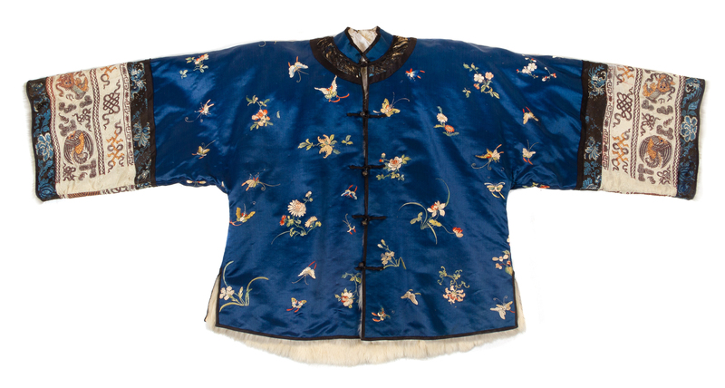 An Embroidered Silk Blue Ground Lady's Winter Jacket Height collar to hem 27 inches.