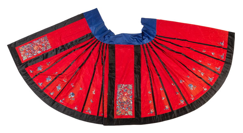 A Red Ground Embroidered Silk Apron Skirt Length 38 inches.