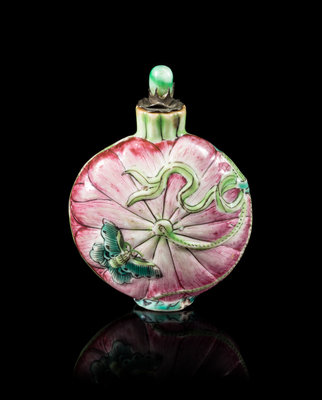 A Famille Rose Porcelain 'Lotus' Snuff Bottle Height 3 1/8 inches.