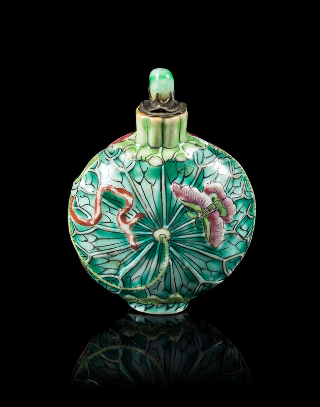 molded as a blossoming lotus on one side and the leaf pad on the reverse, encircled by stems and ribbons, each side painted with a butterfly, metal and glass stopper.