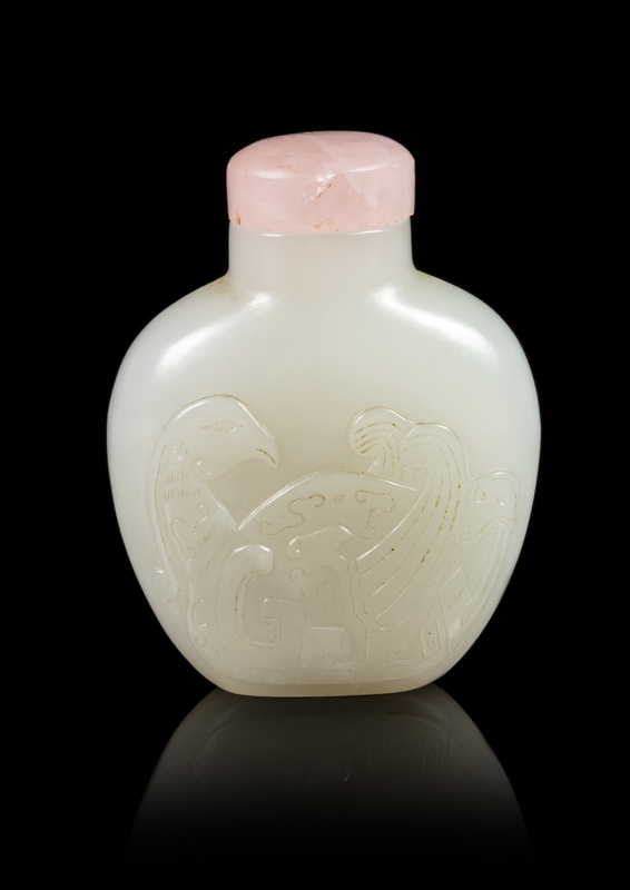 of flattened, rounded form and carved on both sides with bats amidst waves, with a tourmaline stopper.