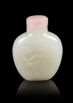 A Carved White Jade Snuff Bottle Height 2 1/2 inches.