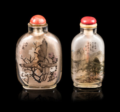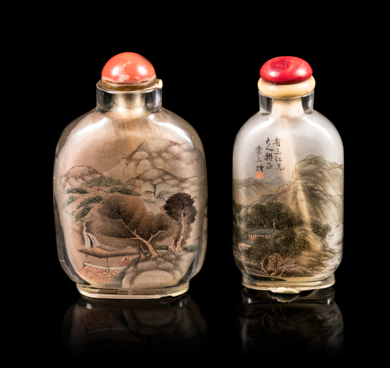 Two Inside Painted Glass Snuff Bottles Height of larger 2 3/4 inches.
