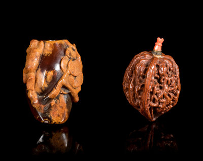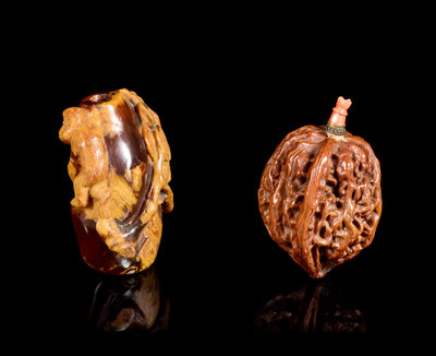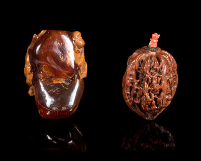 comprising one walnut example with coral and metal stopper, one amber example carved with a monkey and pine trees.