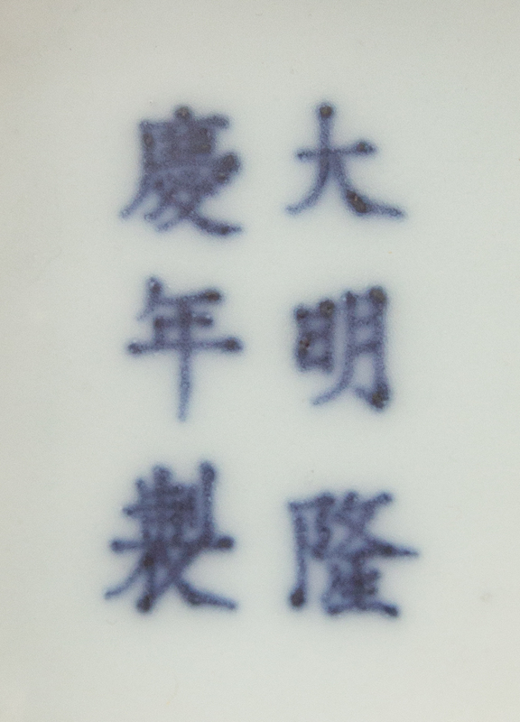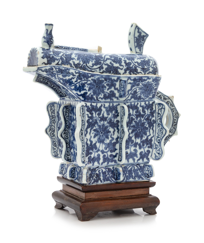the body in the shape of an archaistic bronze ewer and decorated with notched flanges, the cover with two short posts, overall painted with lotus and leafy branches, underside bearing an apocryphal Longqing six-character mark in underglaze blue.