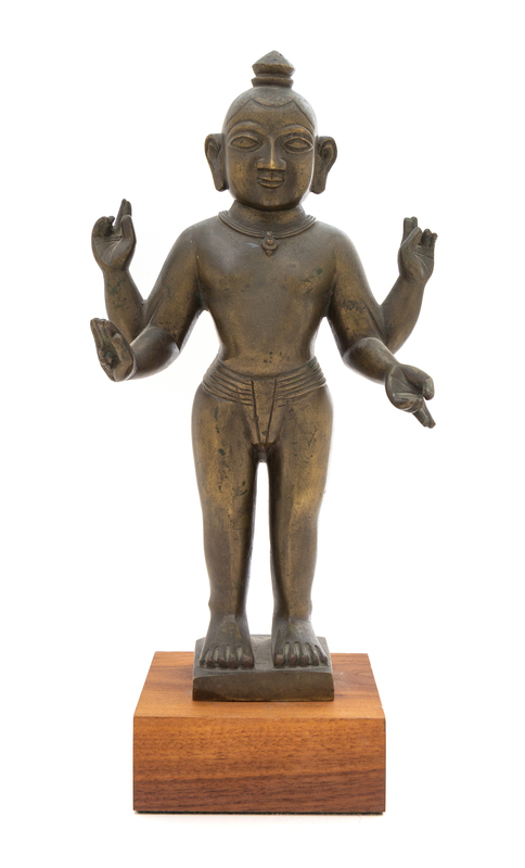 the four-armed deity depicted standing on a square base, the hands in various mudras and the face cast with a calm expression, all hair pulled to tha top knot.