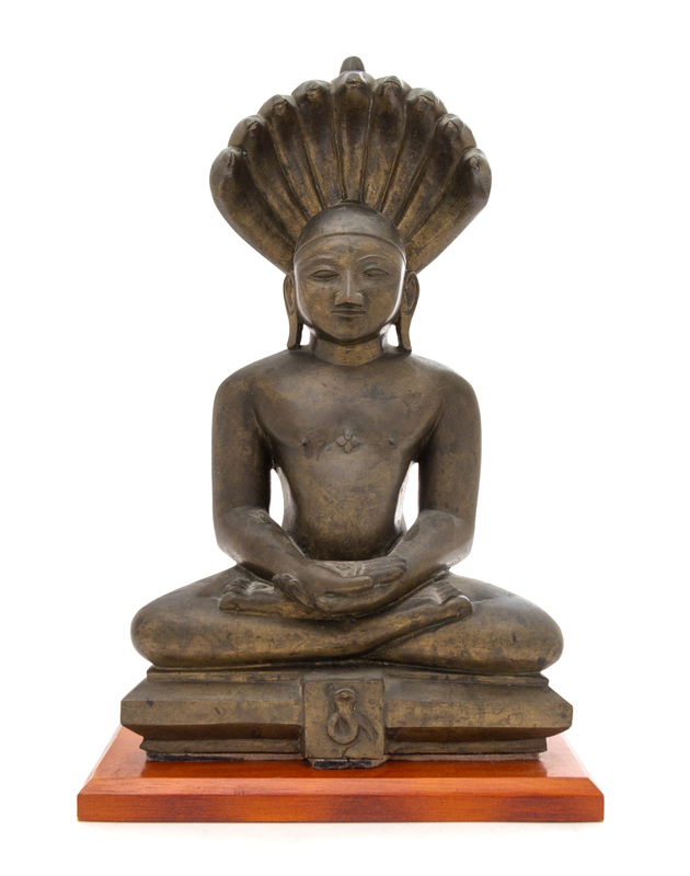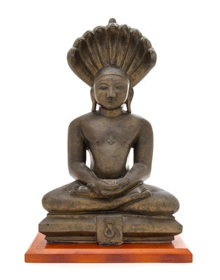 the figure depicted seated in dhyanasana on a square throne with both hands folded at front, the face cast with a serene expression flanked by a pair of elongated earlobes, backed by a serpent.
