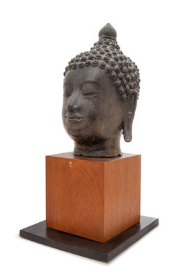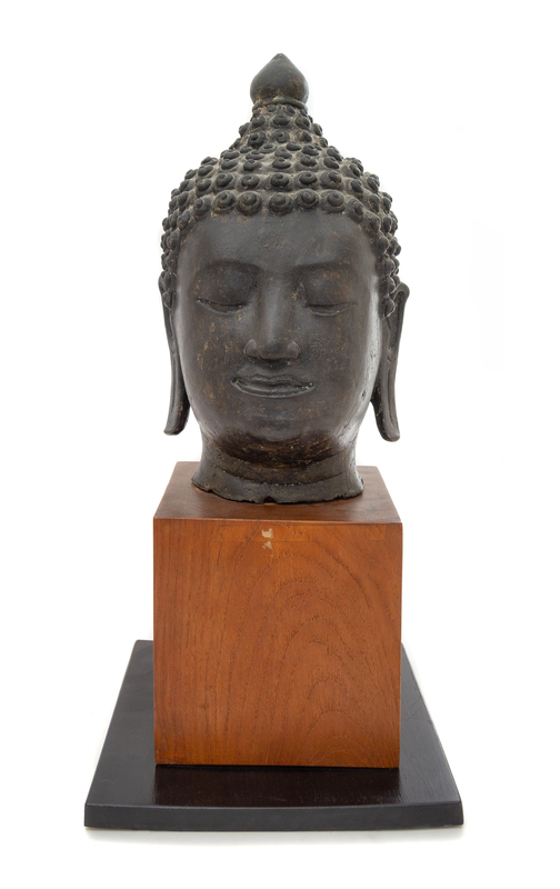 with tight curled hair, elongated ear-lobes and raised ushnisa, with custom wood stands.