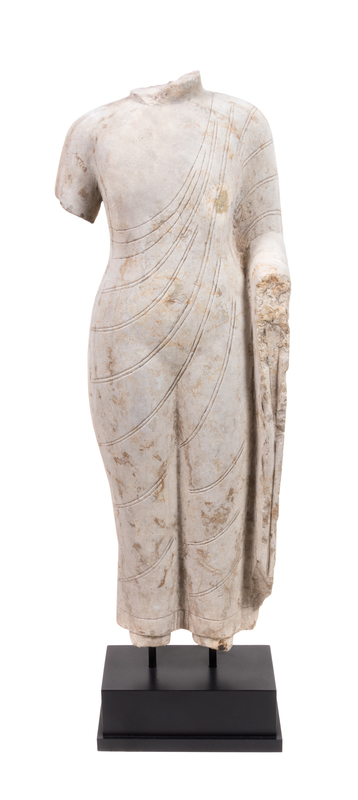 depicted standing, wearing a long incised robe draped over the left shoulder, missing the hands, head and feet.