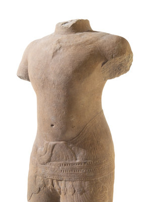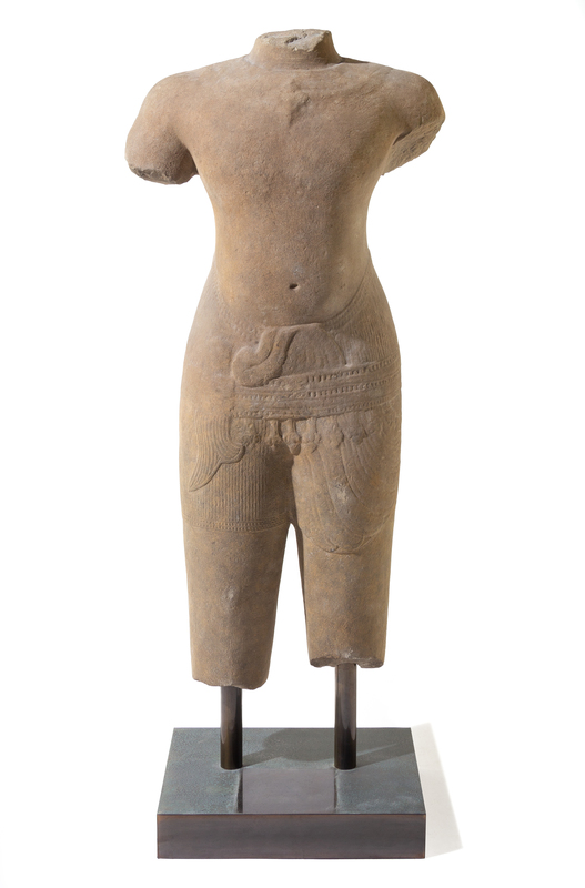 A Khmer Baphuon-Style Limestone Torso of Vishnu Height 43 inches.