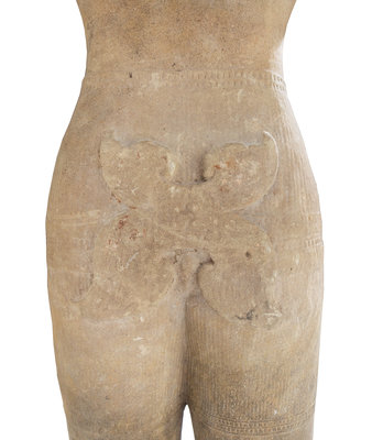 depicted standing in samabhanga, wearing diaphanous sampot secured by a belt with suspending tassels and a butterfly knot at the back, the bare upper body elegantly molded.