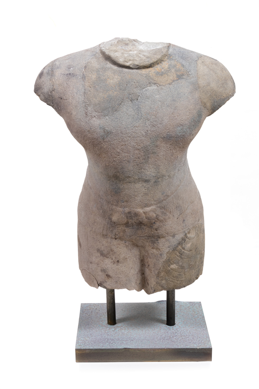 A Khmer Stone Torso of a Temple Guard Height 32 x width 17 1/2 inches.