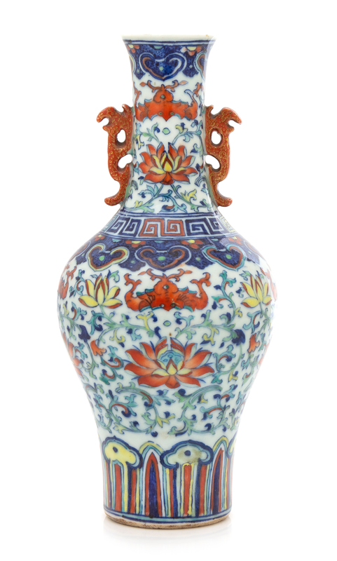 the baluster form body painted with Buddhist emblems amongst stylized scrolling lotus, the neck decorated with two descending bats ablove large lotus blossoms and applied on either side with an iron-red enamelled chilong handle, the base in glazed white and drilled.