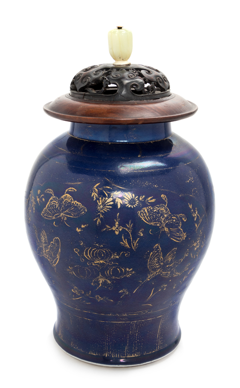 the baluster body decorated with gilt highlights shwoing butterflies in flight above floral scrolls, together with a fitted hardwood cover carved with large ruyi heads and surmounted by a jade melon-form finial.