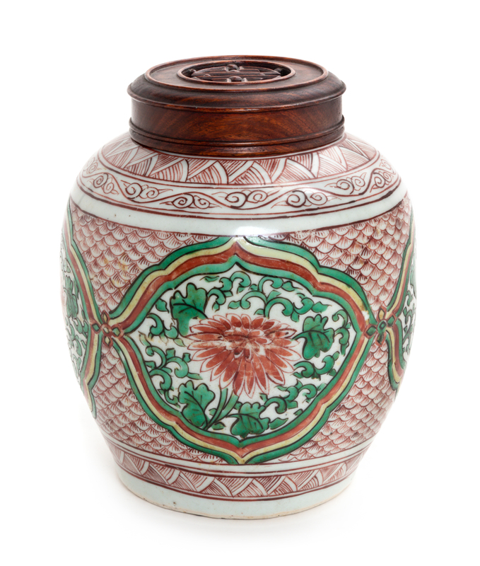 A Famille Verte Porcelain Ginger Jar and Cover Height 8 inches.