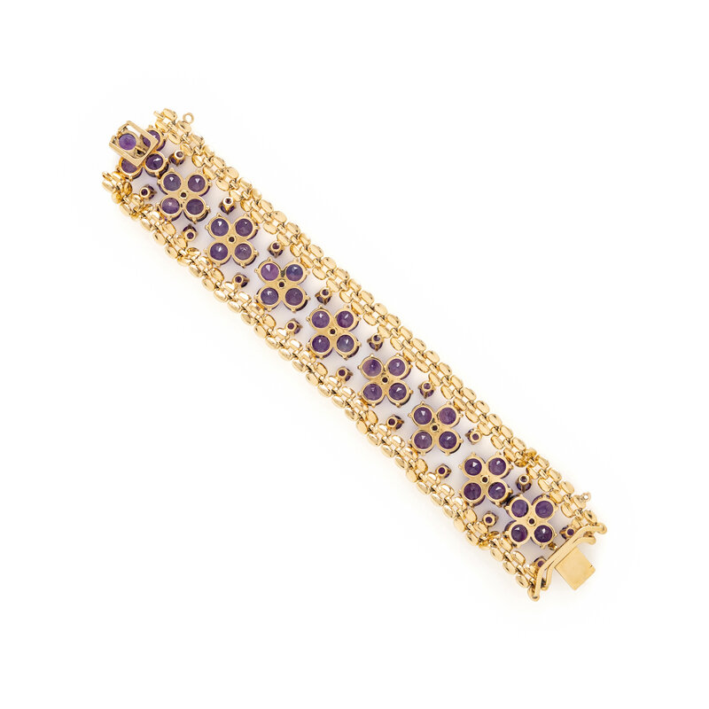 Round amethysts. 14 karat yellow gold. 7 inches long, 1 1/8 inches wide.