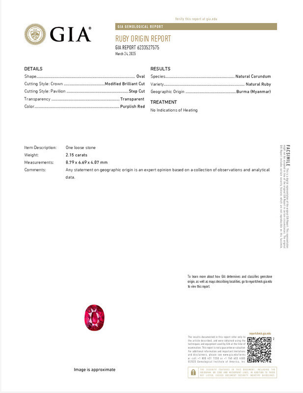 GIA, 2025, Report No. 6233527575, 2.15 carats, Natural Corundum, Natural Ruby, Transparent, Purplish Red, Burma (Myanmar), No Indications of Heating
