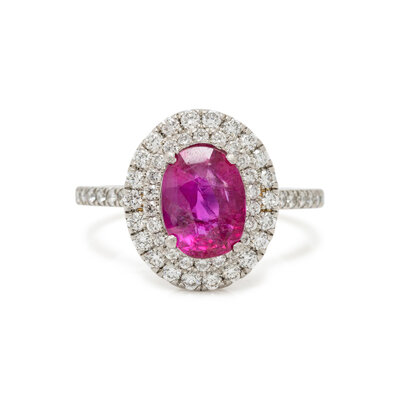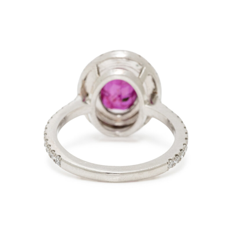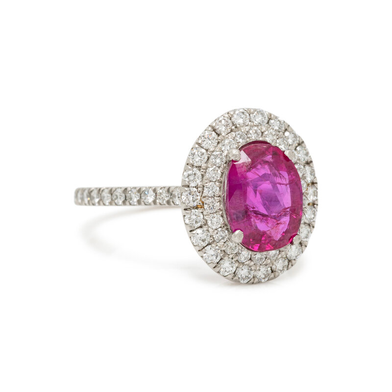 Oval Burmese ruby weighing 2.15 carats and round diamonds weighing approximately 0.55 carat total. Platinum. Ring size 6.