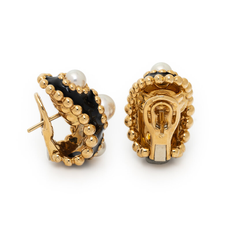 Cultured pearls measuring approximately 4.75 - 6.35 mm and black enamel. 18 karat yellow gold. 7/8 inch long.