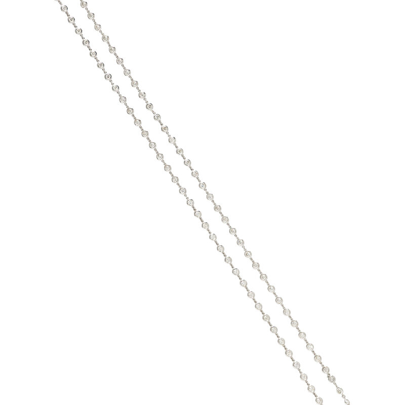 Round diamonds weighing approximately 11.00 carats total. 14 karat white gold. 34 1/2 inches long