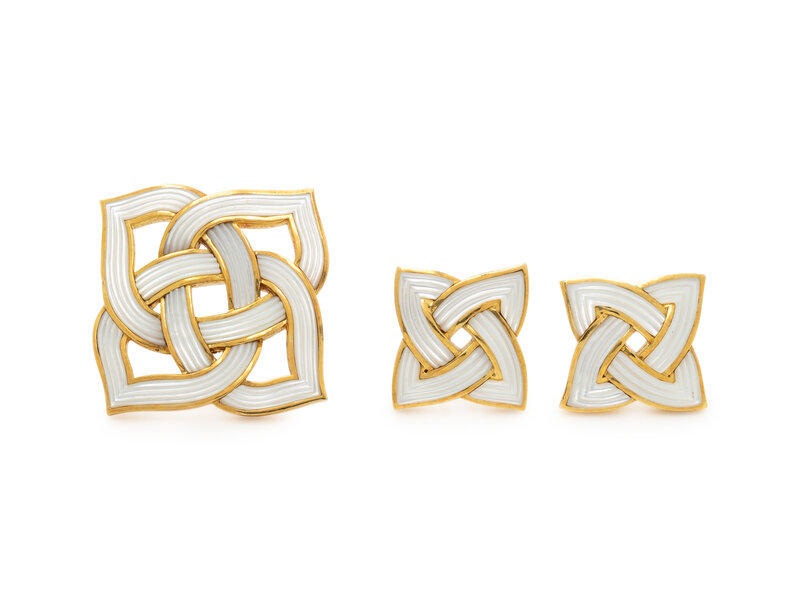 ANGELA CUMMINGS, MOTHER-OF-PEARL AND YELLOW GOLD CELTIC KNOT BROOCH AND EARRINGS