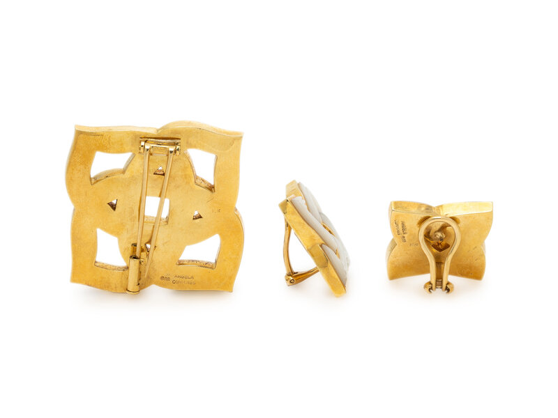 Carved mother-of-pearl. 18 karat yellow gold. Brooch: 1 3/8 x 1 3/8 inches. Earrings: 7/8 inch.