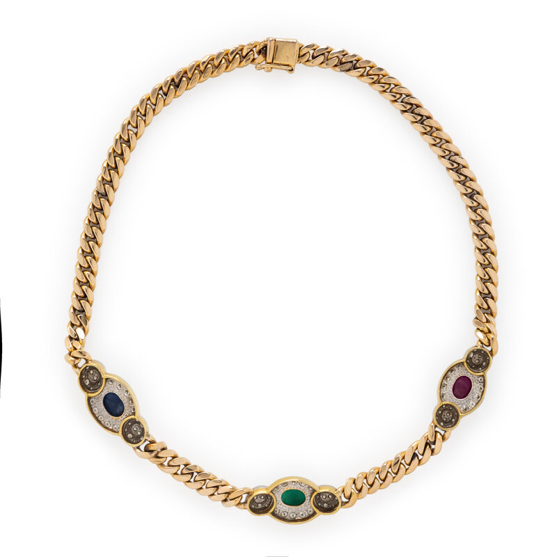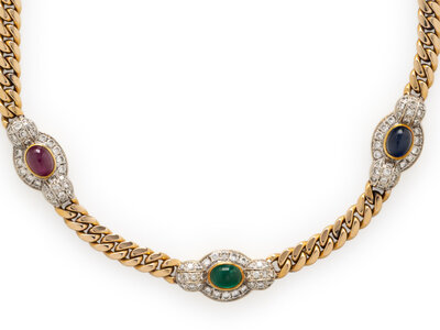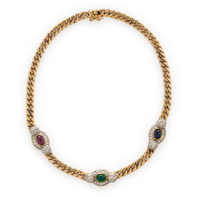 Round diamonds weighing approximately 2.35 carats total, and oval cabochon ruby, emerald, and sapphire. Yellow and white gold. 15 3/4 inches long.