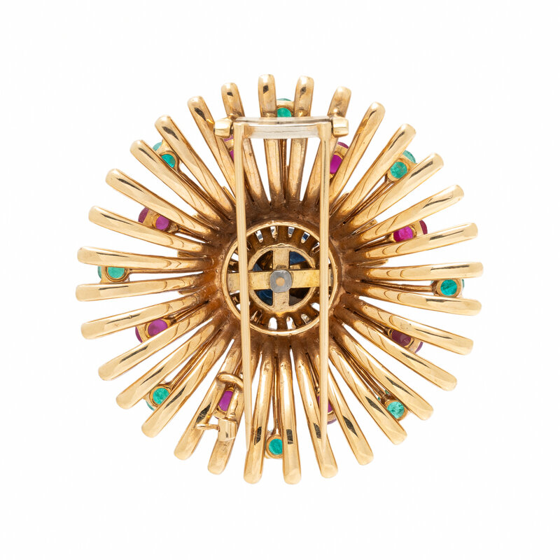 Round sapphire, round diamonds weighing approximately 1.20 carats total, oval cabochon star rubies, and round emeralds. Yellow gold. 1 7/8 x 1 7/8 inches.