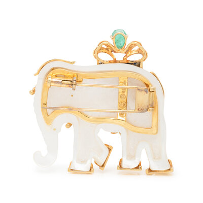 MOTHER-OF-PEARL, MULTIGEM, AND YELLOW GOLD ELEPHANT BROOCH