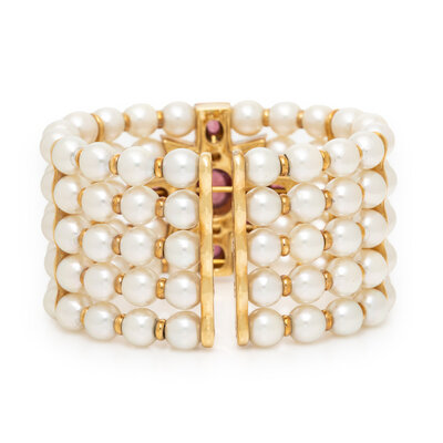 CULTURED PEARL, PINK TOURMALINE, AND DIAMOND MALTESE CROSS CUFF BRACELET