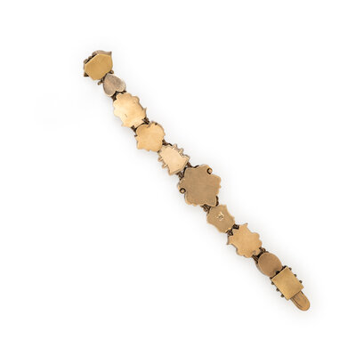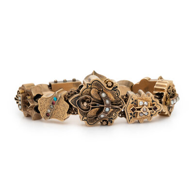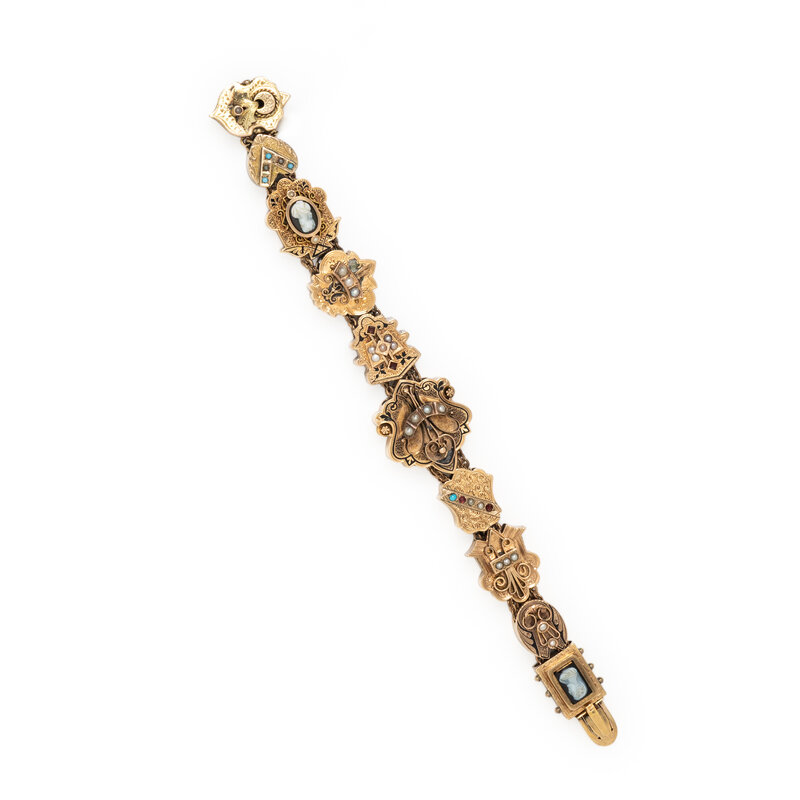 Ten slide charms, set throughout with seed pearls, enamel, cameos, and colored stones. 14 karat yellow gold. 7 inches long.