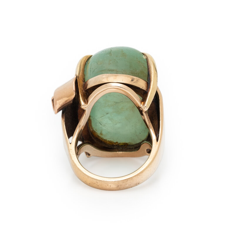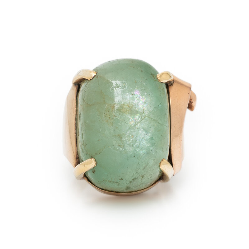 Oval cabochon green beryl weighing approximately 41.00 carats by formula. Rose gold. Ring size 6.