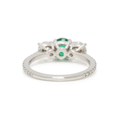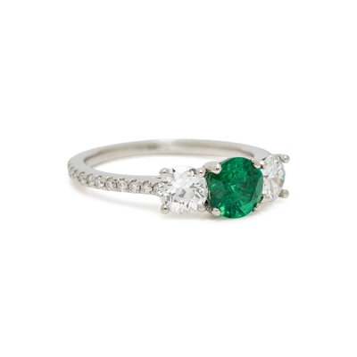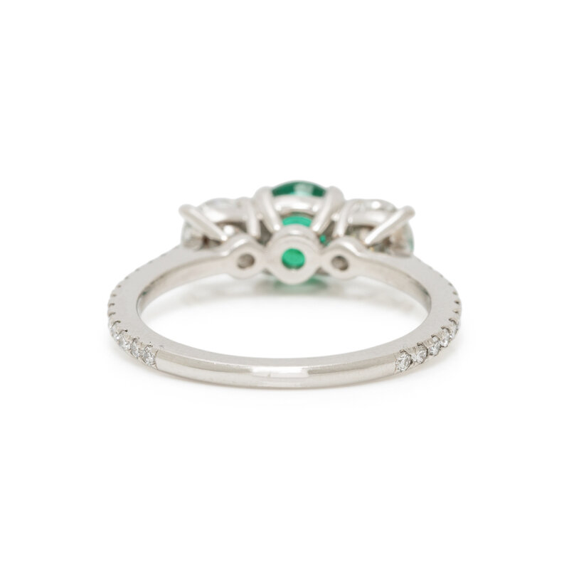 Round emerald weighing approximately 0.65 carat by formula and round diamonds weighing approximately 0.90 carats total. Platinum. Ring size 6.