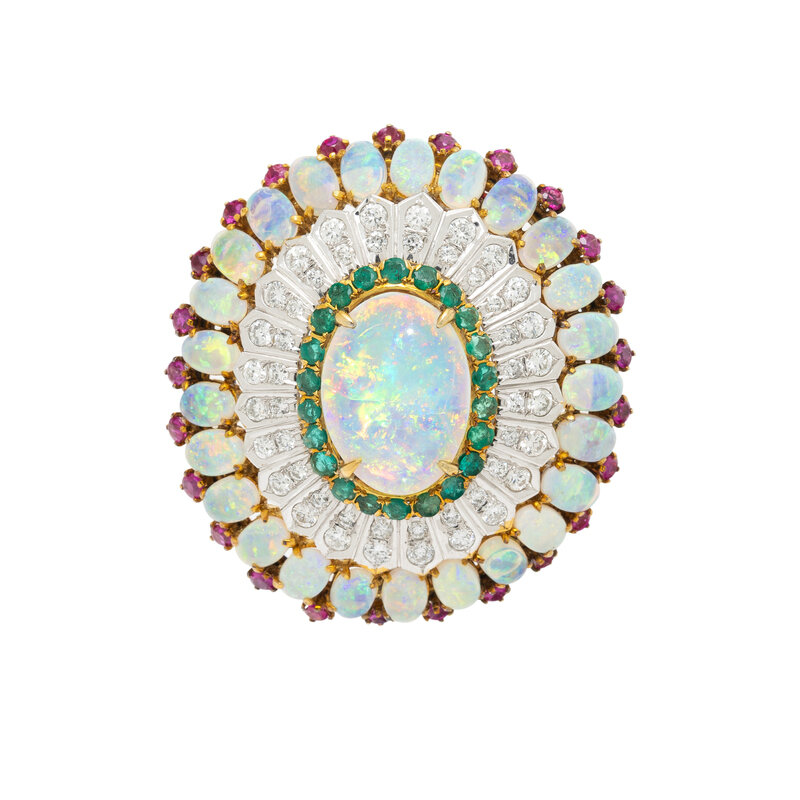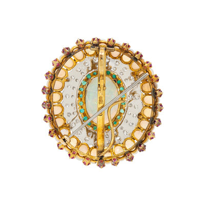 Oval cabochon opal measuring approximately 17.00 x 12.25 mm, round emeralds, round diamonds weighing approximately 1.50 carats total, oval cabochon opals, and round rubies. 18 karat yellow and white gold. 1 5/8 x 1 1/2 inches.