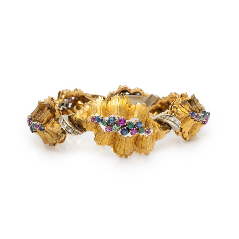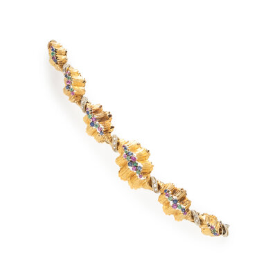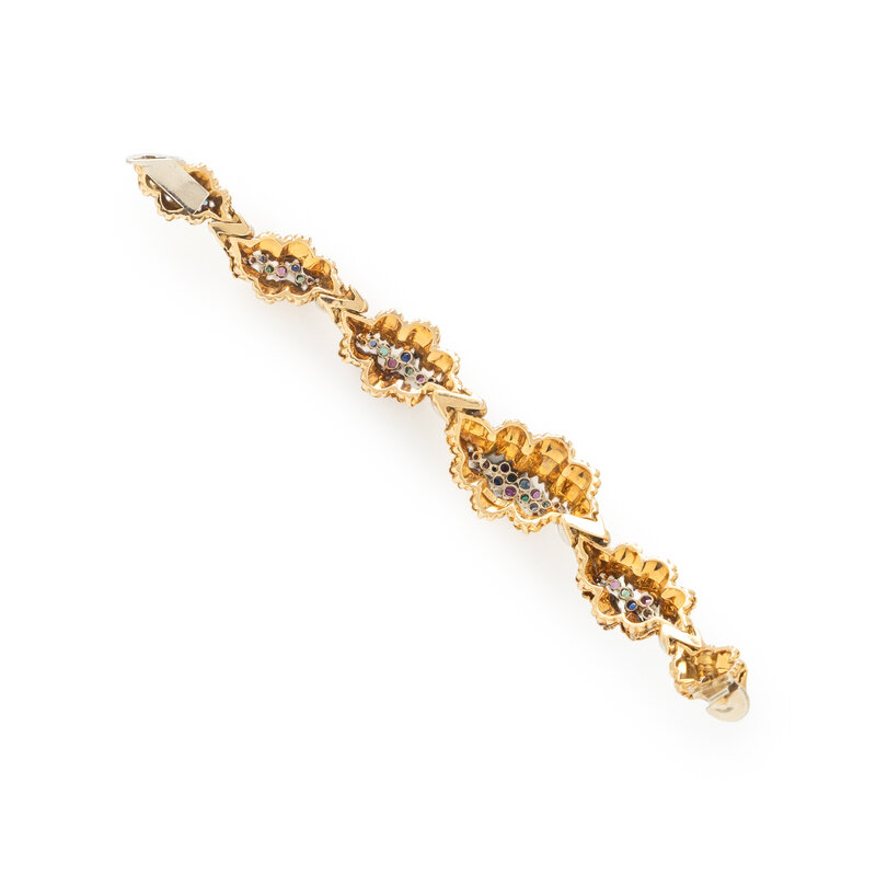 Round rubies, emeralds, sapphires, and diamonds. 18 karat yellow and white gold. 6 inches long.