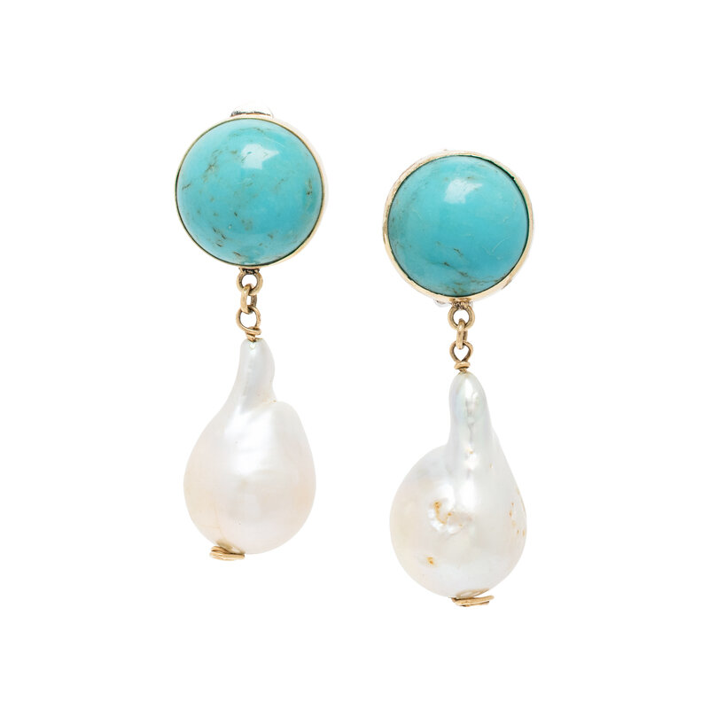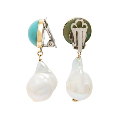 Round cabochon turquoise measuring approximately 13.00 mm and baroque cultured pearls measuring approximately 20.00 - 21.50 mm. Yellow gold with metal clip backs. 1 1/2 inches long.