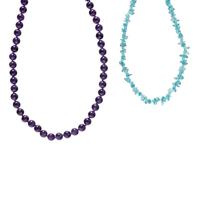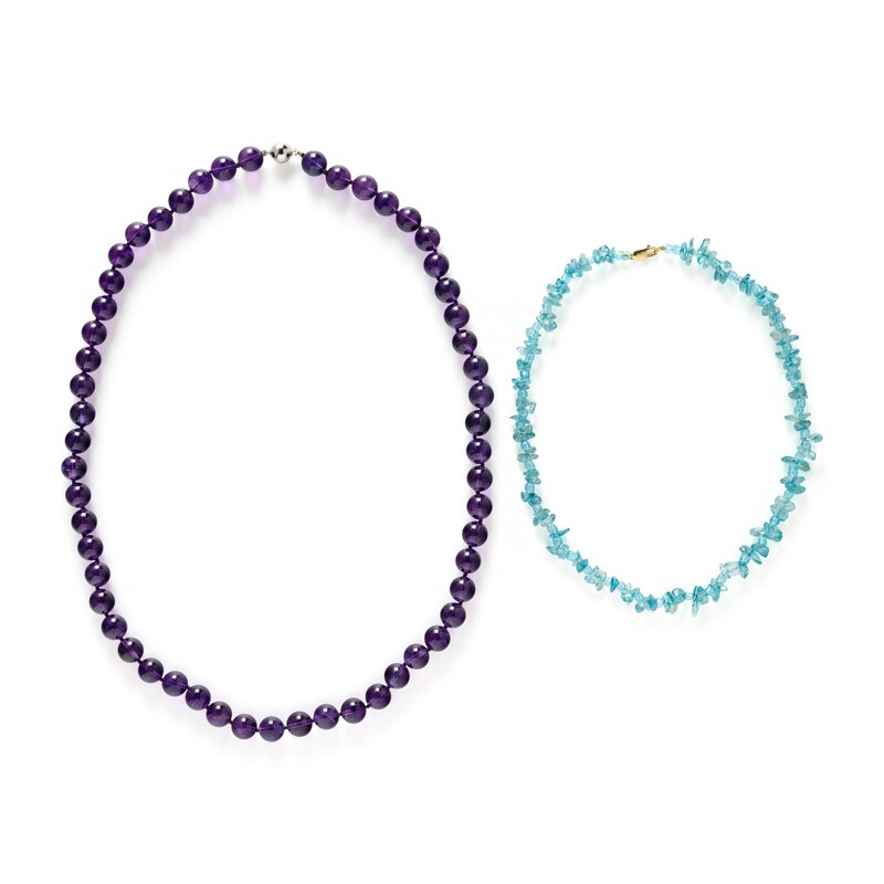 Including two beaded necklaces, one with round amethyst beads measuring approximately 10.85 mm and the other with tumbled dyed blue quartz beads measuring approximately 3.75 - 8.50 mm. 14 karat white and yellow gold. 26 inches long. 16 inches long.