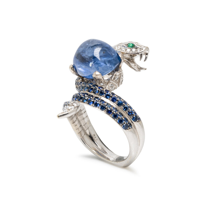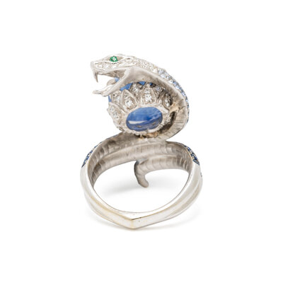 SAPPHIRE, DIAMOND, AND WHITE GOLD SNAKE RING
