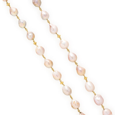 Baroque pink cultured pearls (origin of color not tested) measuring approximately 14.50 - 18.75 mm. Yellow gold. 34 1/2 inches long.