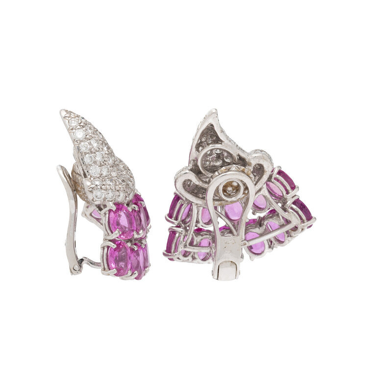 Round diamonds weighing approximately 3.25 carats total and oval pink sapphires. 18 karat white gold. 1 1/4 inches long.