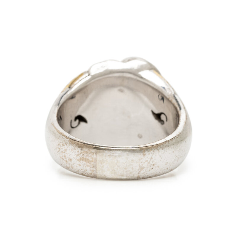 Pavé-set round diamonds weighing approximately 0.40 carat total. Platinum and 18 karat yellow gold. Ring size 9.