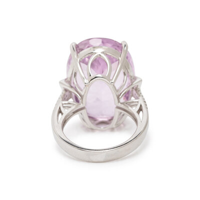 Oval checkerboard-faceted kunzite weighing approximately 37.55 carats and round diamonds. 14 karat white gold. Ring size 7.