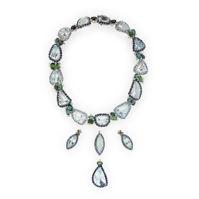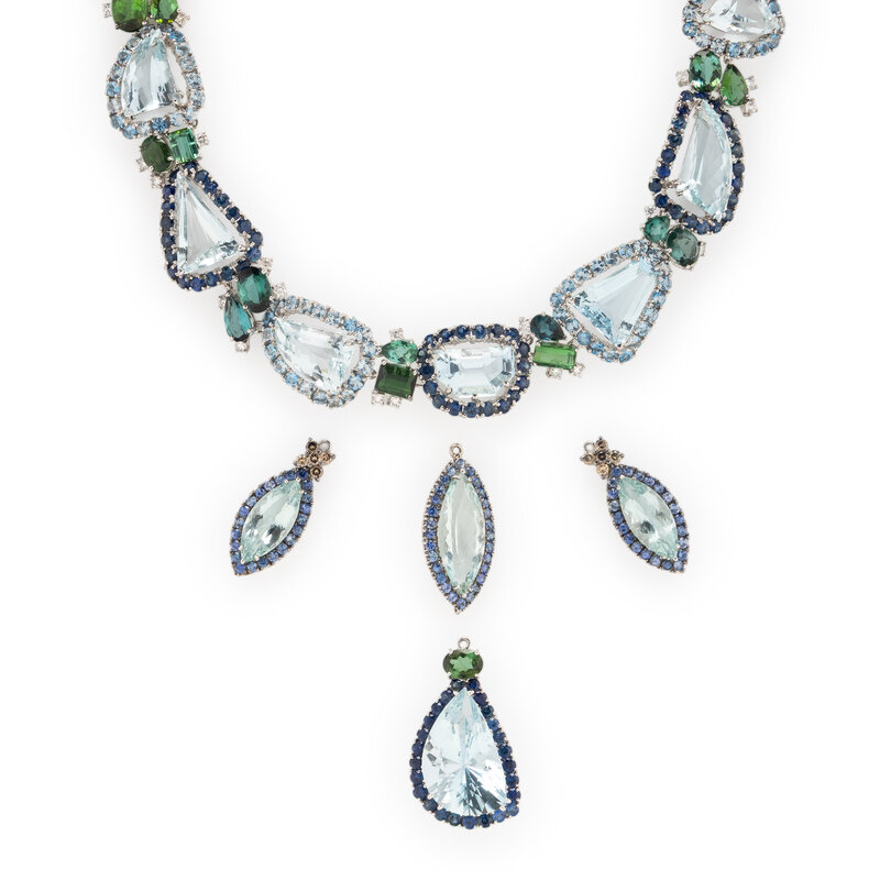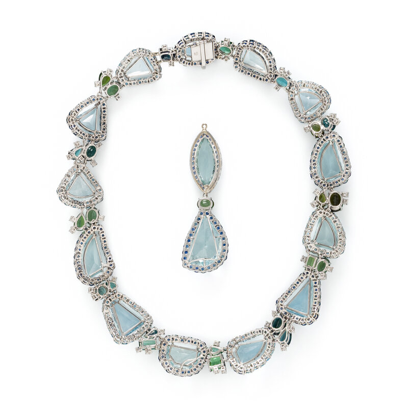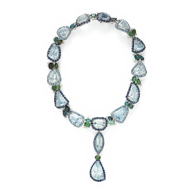 Including a necklace and four detachable pendant drops, some of which may be connected to form a longer drop or used as earring drops, set with variously cut aquamarines, round sapphires, variously cut green and blue tourmalines, round diamonds weighing approximately 2.20 carats total, and round brown diamonds (origin of color not tested). 18 karat white gold. Necklace: 17 inches long. Drops 1 1/4 - 1 3/8 inches long.