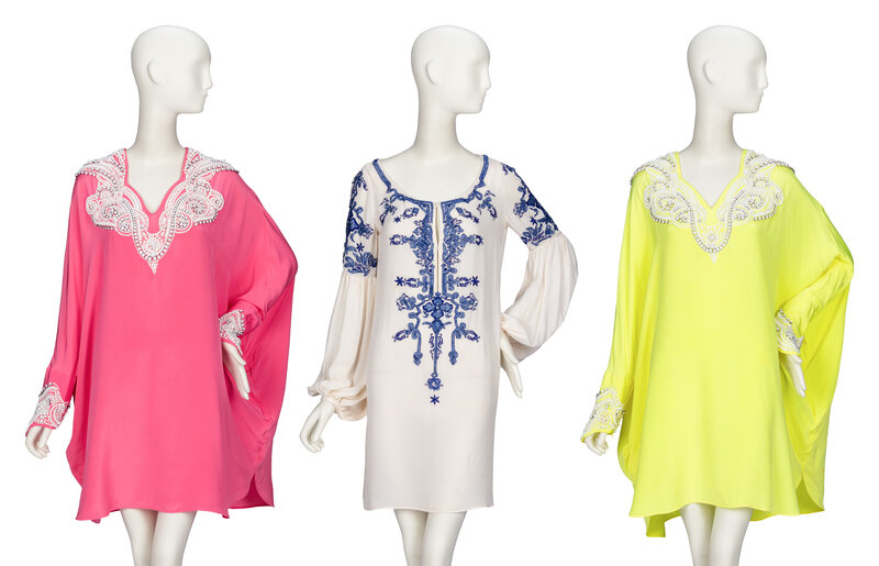 Thigh-length kaftan blouse/minidress in highlighter yellow silk crêpe de chine with white bead embellishments throughout. Shaped V neckline. Full-length dolman sleeves with embellished cuffs. In-seam pockets at side seams. No closures. Unlined.