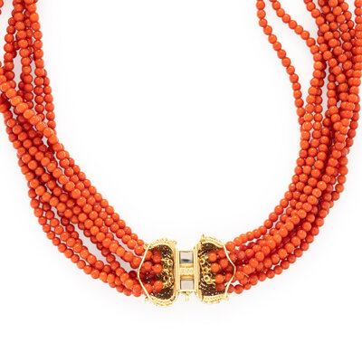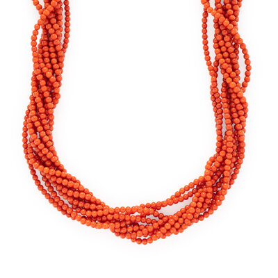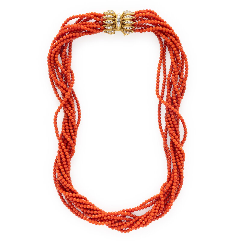 CORAL, DIAMOND, AND YELLOW GOLD TORSADE NECKLACE