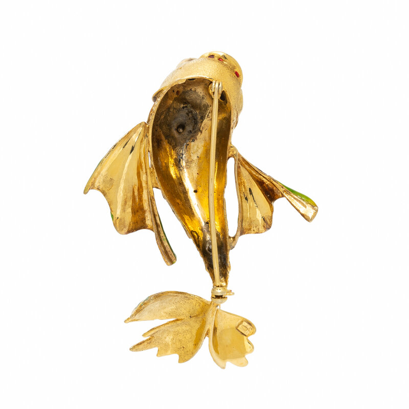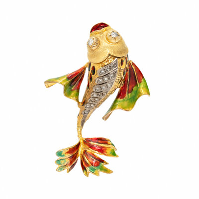 Round and single cut diamonds weighing approximately 0.35 carat gold, and polychrome enamel. Yellow and white gold. 2 1/2 x 1 3/4 inches long.
